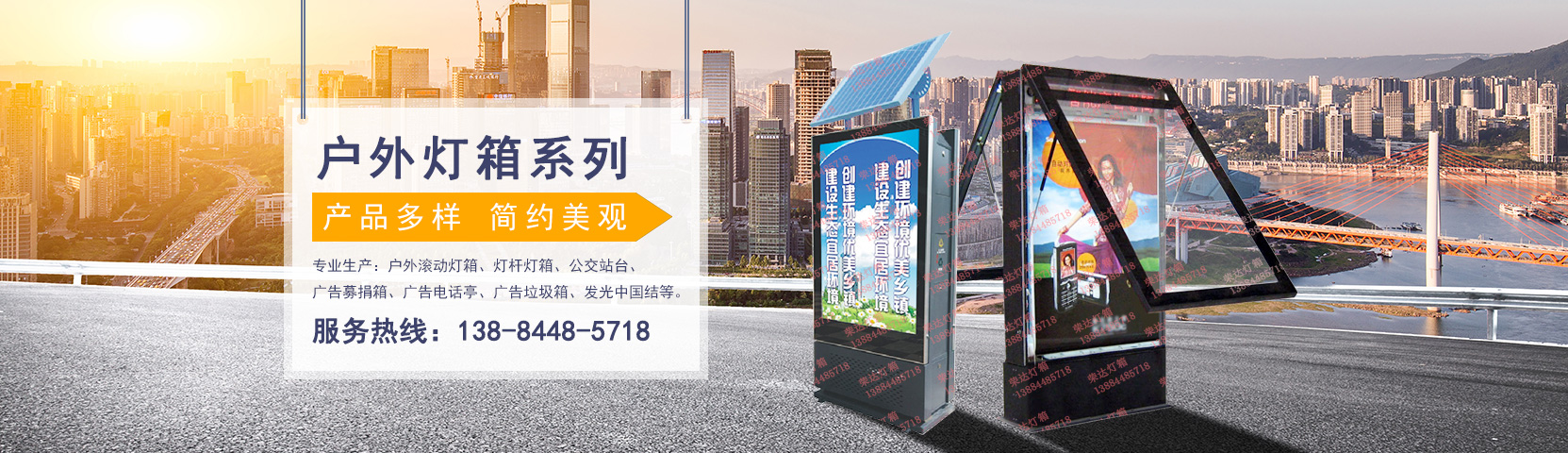 專業生產戶外滾動燈箱 燈桿燈箱 公交站臺 廣告募捐箱 廣告電話亭 廣告垃圾箱 廣告擦鞋機 太陽能燈箱 指路牌燈條 吸塑燈箱等媒體發布設備, 伴隨著中國的改革開放和中國經濟建設的大發展......